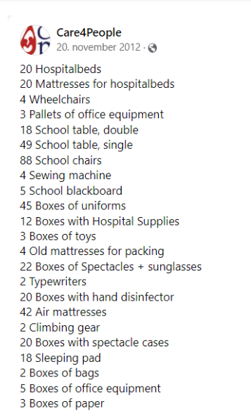 Straks efter at være hjemkommet fra 3 års udsendelse til Binga området startede Rie Hartmann og Morten Helmø med at sende udstyr til Zimbabwe. Den første container blev sendt allerede i 2010. Det er siden blevet til en anseeligt antal afsendte containere, 1-2 containere om året. Containerforsendelser er dyre, og hvert et lille rum er blevet udnyttet, for at få så meget afsted som muligt.